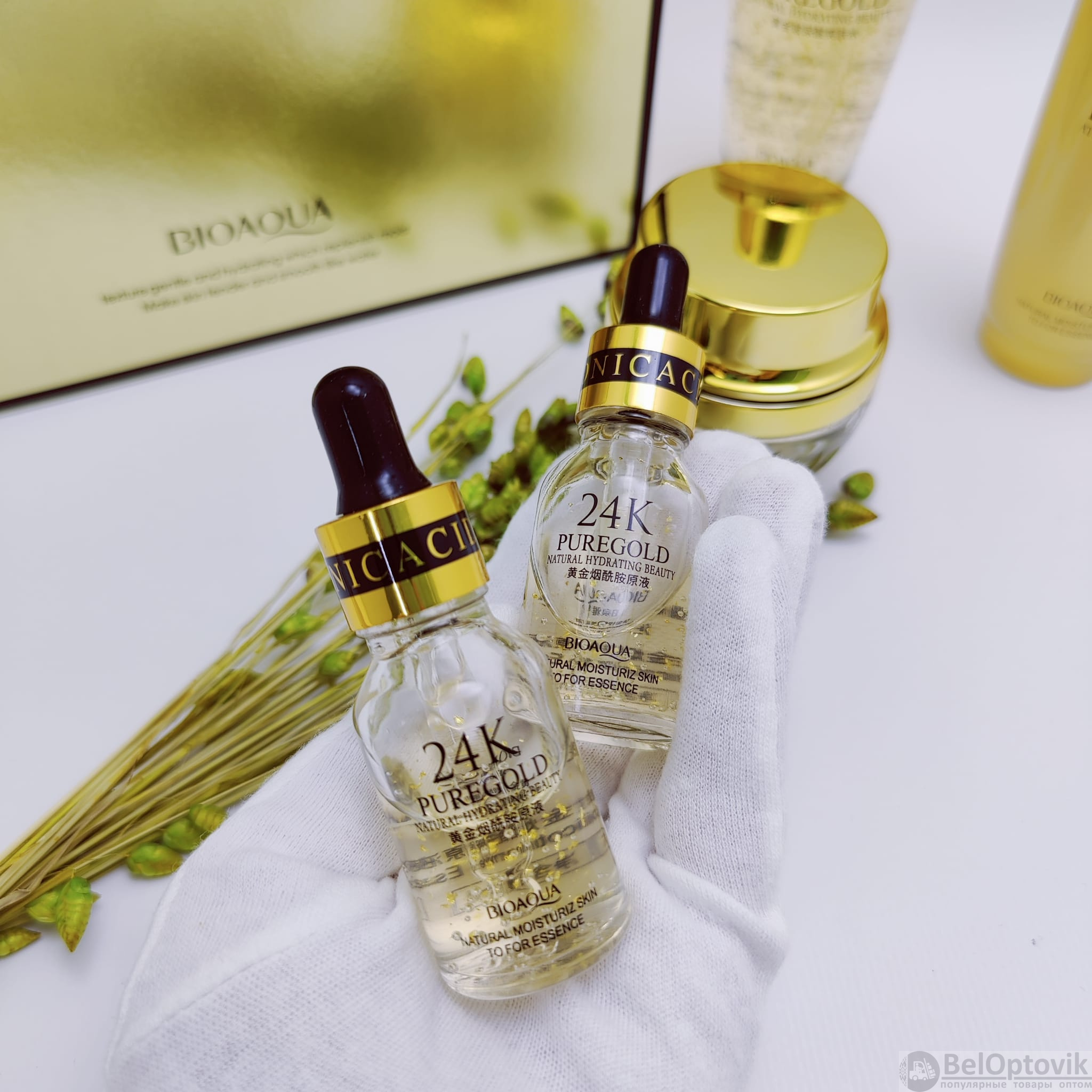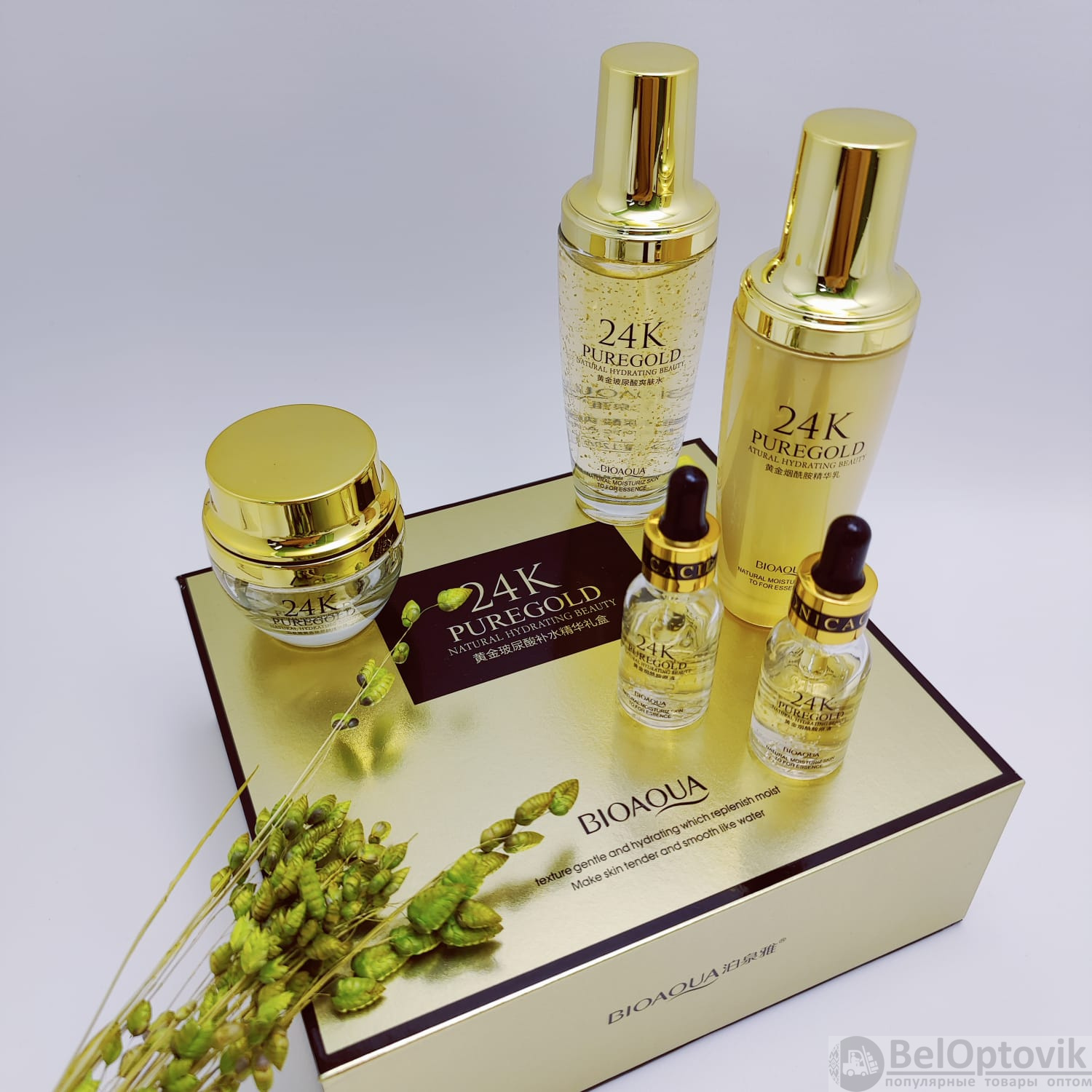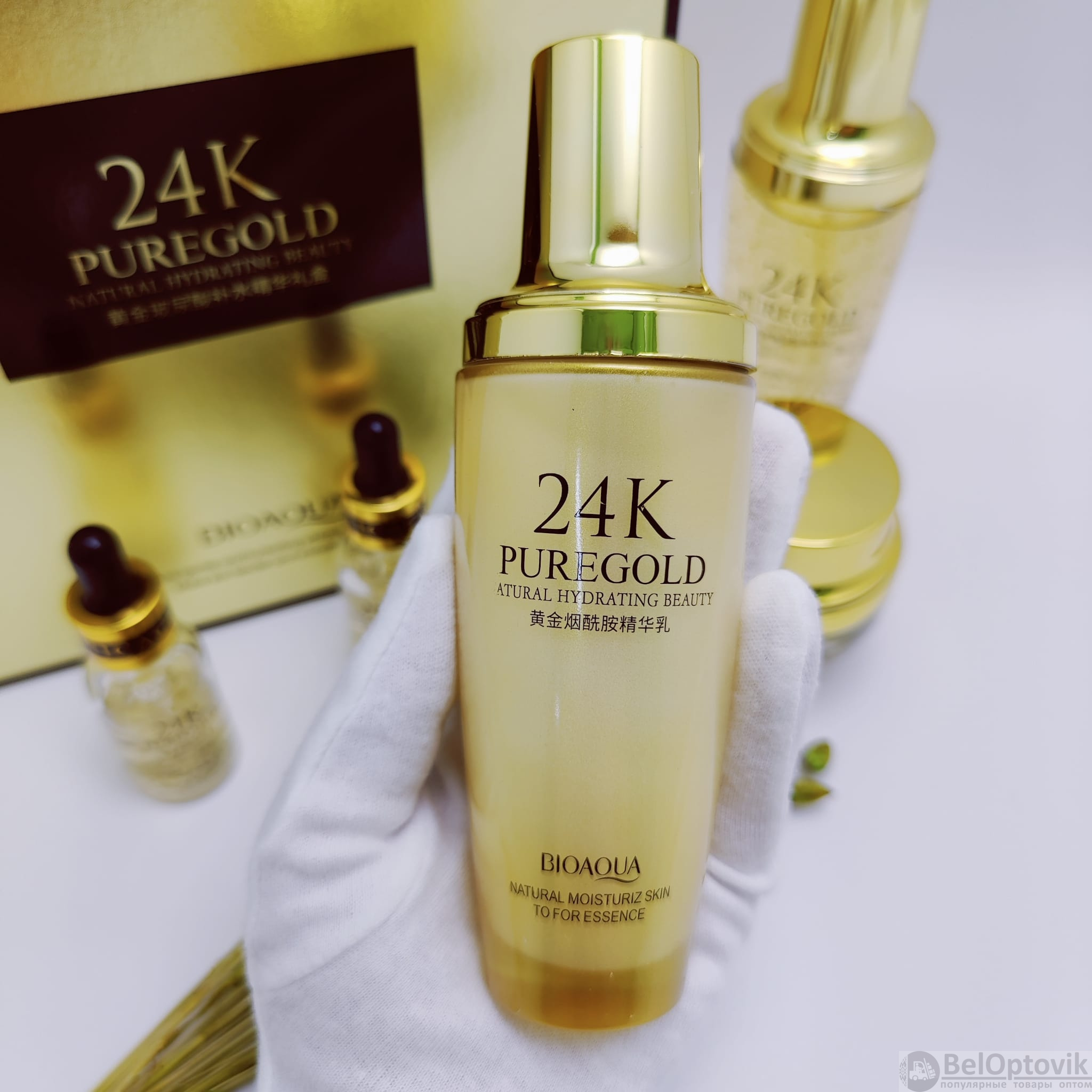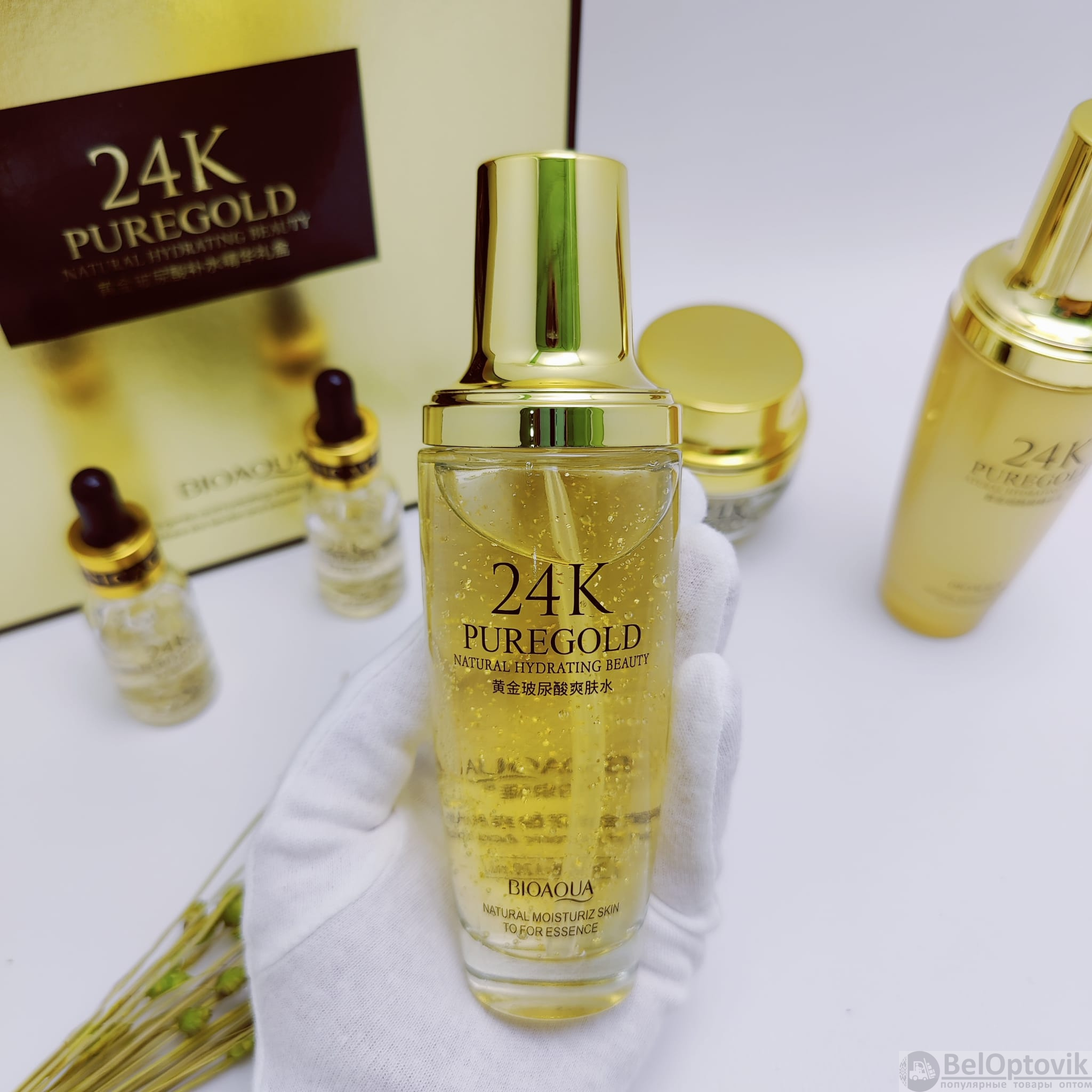Купить пПодарочный набор уходовой косметики Bioaqua 24K Pure Gold Set с частицами золота и гиалуроновой кислотой (5 средств) на нашем сайте можно ОПТОМ от 20 шт. или не менее 5, если Вы покупаете у нас и другие товары (сборный заказ).