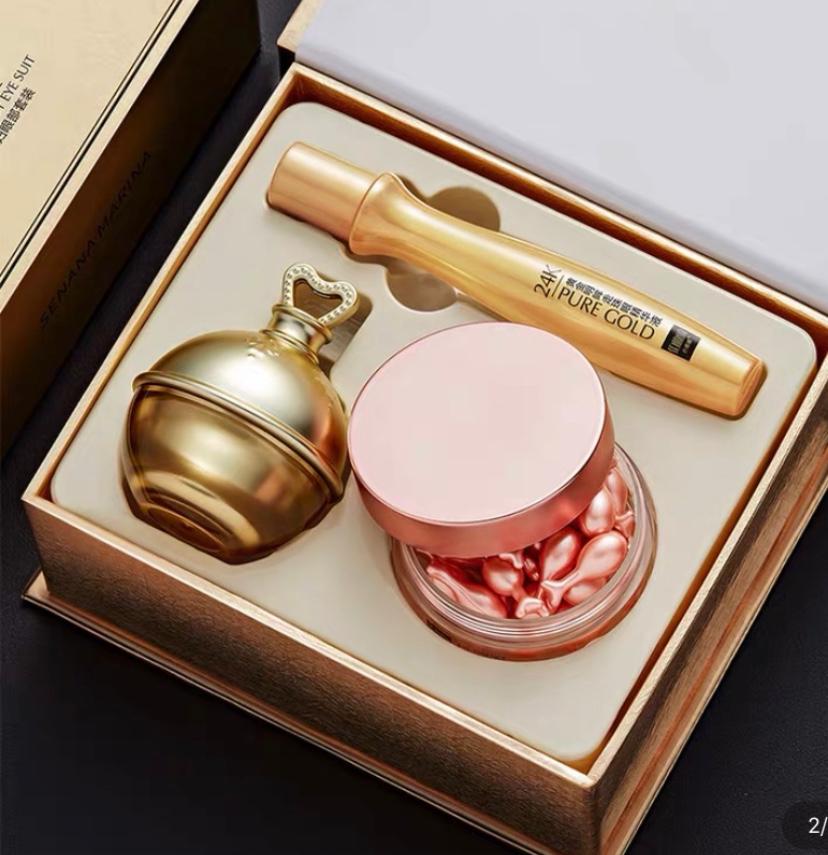 Великолепный подарок для любой женщины - это подарочный набор Senana Marina Lady Essence Moisturizing Lady Eye Suit состоящий из сыворотки-роллера, капсульной сыворотки для области вокруг глаз и омолаживающего крема для области вокруг глаз.