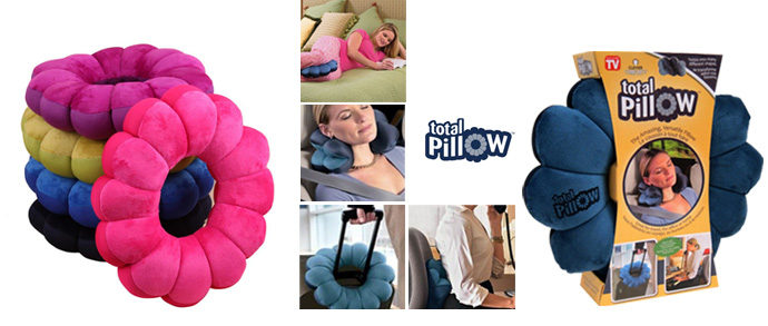 Подушка Total Pilows универсальная подушка трансформер. Это 100%-й комфорт и релаксация для вашей шеи: за рабочим столом, перед телевизором, в автобусах, самолётах и поездах. Гибкая и эластичная подушка в точности повторяет контуры позвоночника. Можно сгибать её, как угодно: свернуть её в двойное кольцо, и она поддержит поясницу при работе за компьютером, сложить пополам и шея будет отдыхать при просмотре фильма. Подушку Total Pillow можно подложить на сиденье жёсткого стула или использовать для расслабления усталых ног.