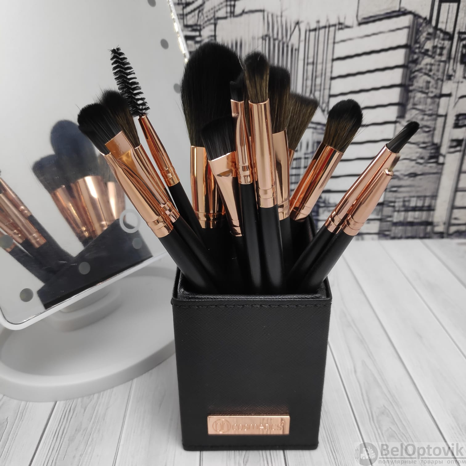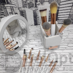 Стильный и утонченный набор выполнен в классическом черном (белом), матовом основании кистей и золотом наконечнике. Кисти имеют плотно набитый синтетический ворс, который увеличивает срок службы (не линяет, не теряет форму и не вызывает аллергии), по длине не превышают 9 см, благодаря этому их удобно хранить в специальной подставке с фирменным логотипом. В набор входят: кисти для кремовых и жидких средств, для теней и растушевки, для подводки, бровей, контурирования. Для удобного использования, подставка выполнена в скошенном варианте.