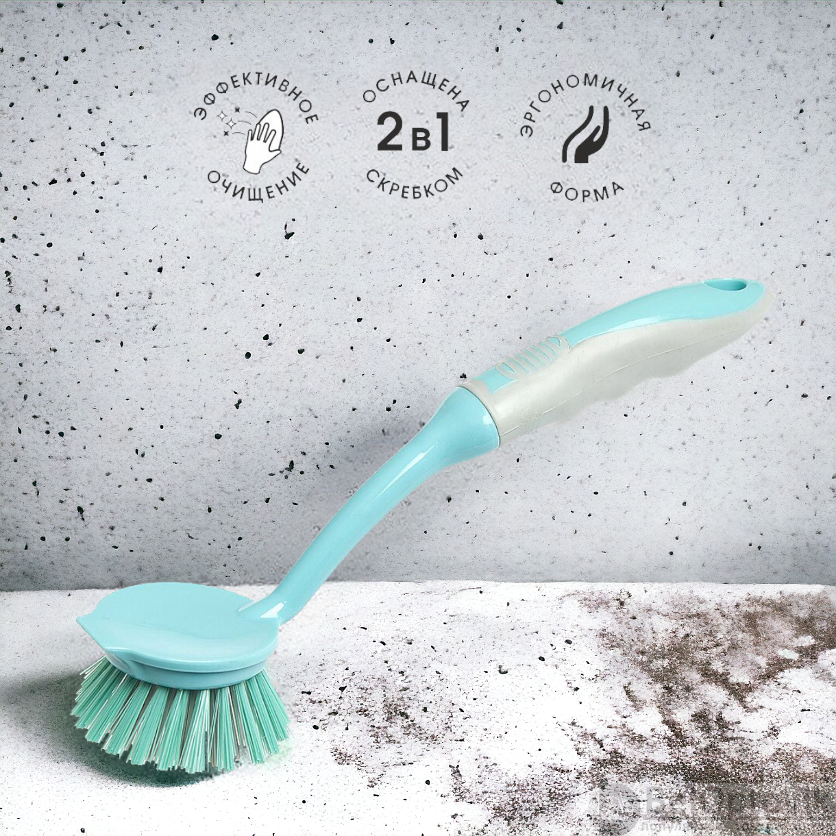 Эргономичная форма прорезиненной ручки. Эффективно справляется с загрязнениями. Щетина средней жесткости.