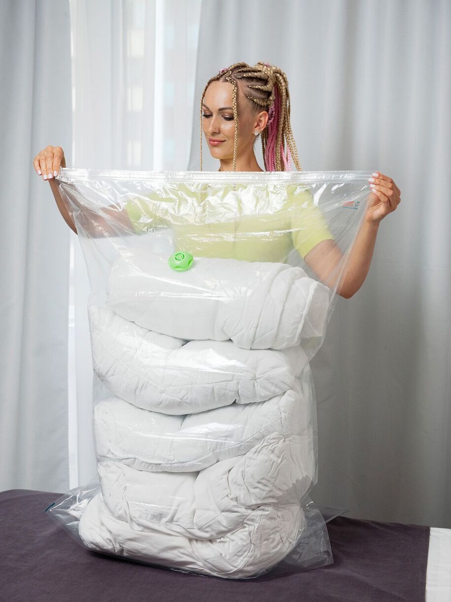 Размер пакета 80*100*34см предназначен для хранения сезонных вещей в межсезонье, отлично подойдет для хранения одеял.