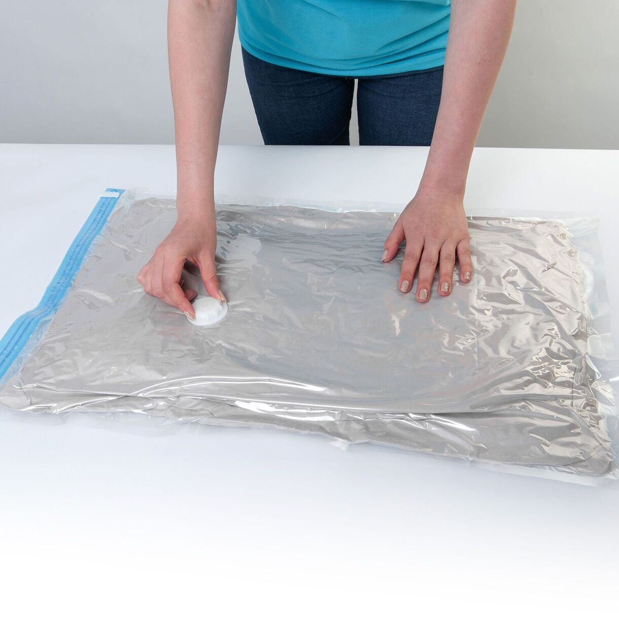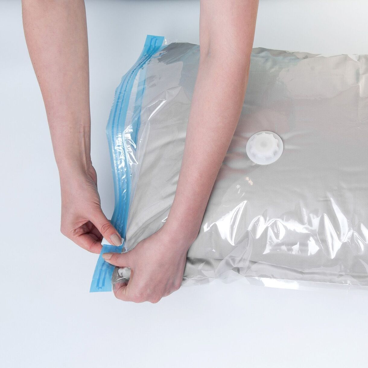 Пакет оснащен клапаном, который позволяет завакуумировать вещи за считанные секунды с помощью пылесоса.