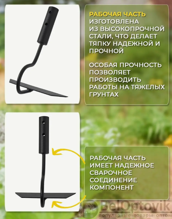 - Удобная и надежная конструкция: тяпка садовая с черенком предназначена для комфортной работы.