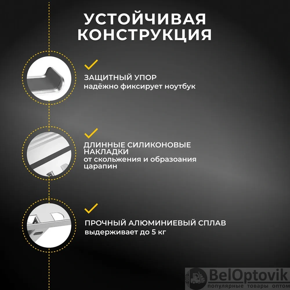 Особенностью этой подставки является наличие шести уровней наклона (от 5,5 до 15,5 см), что позволяет настроить её под удобный угол работы. Силиконовые вставки обеспечивают устойчивость ноутбука на подставке и предотвращают его скольжение.