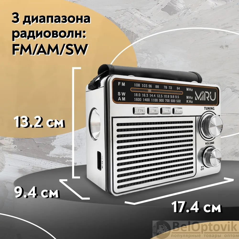 Этот радиоприемник оснащен аналоговым тюнером, который поддерживает диапазоны FM и AM, что позволяет вам наслаждаться широким спектром радиостанций. Встроенный фонарь является полезным дополнением, особенно в ситуациях, когда необходимо освещение.