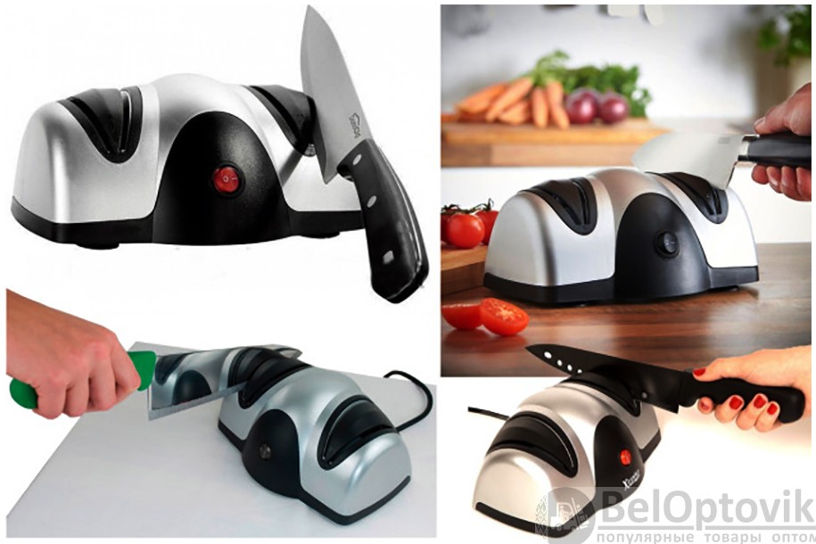 Точилка для ножей электрическая точилка для ножей эргономичная и простая в использовании. Даже женщина сможет справиться с заточкой ножей. Электрическая точилка для ножей обеспечит профессиональное затачивание ножей двухступенчатой системой заточки (шлифовка и полировка). На первой стадии происходит сама заточка ножа, на второй полировка. Ножи станут острыми в одну секунду, все что нужно, это провести нож через соты (специальные прорези) точилки.