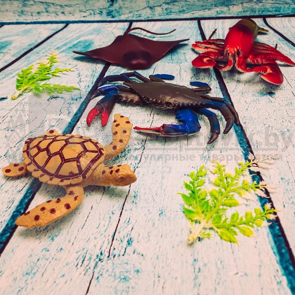 Фигурки морских обитателей набор из четырёх реалистично смоделированных фигурок диких животных. С помощью фигурок дети могут создать свой террариум. Возможно, малыш видел их на картинке, здесь ему предстоит увидеть картинки в объёме, подержать фигуры в руке, изучить их и даже придумать с ними интересную игру. В набор входят: рак, электрический скат, панцирный краб, морская-черепаха, морские водоросли - 2шт.