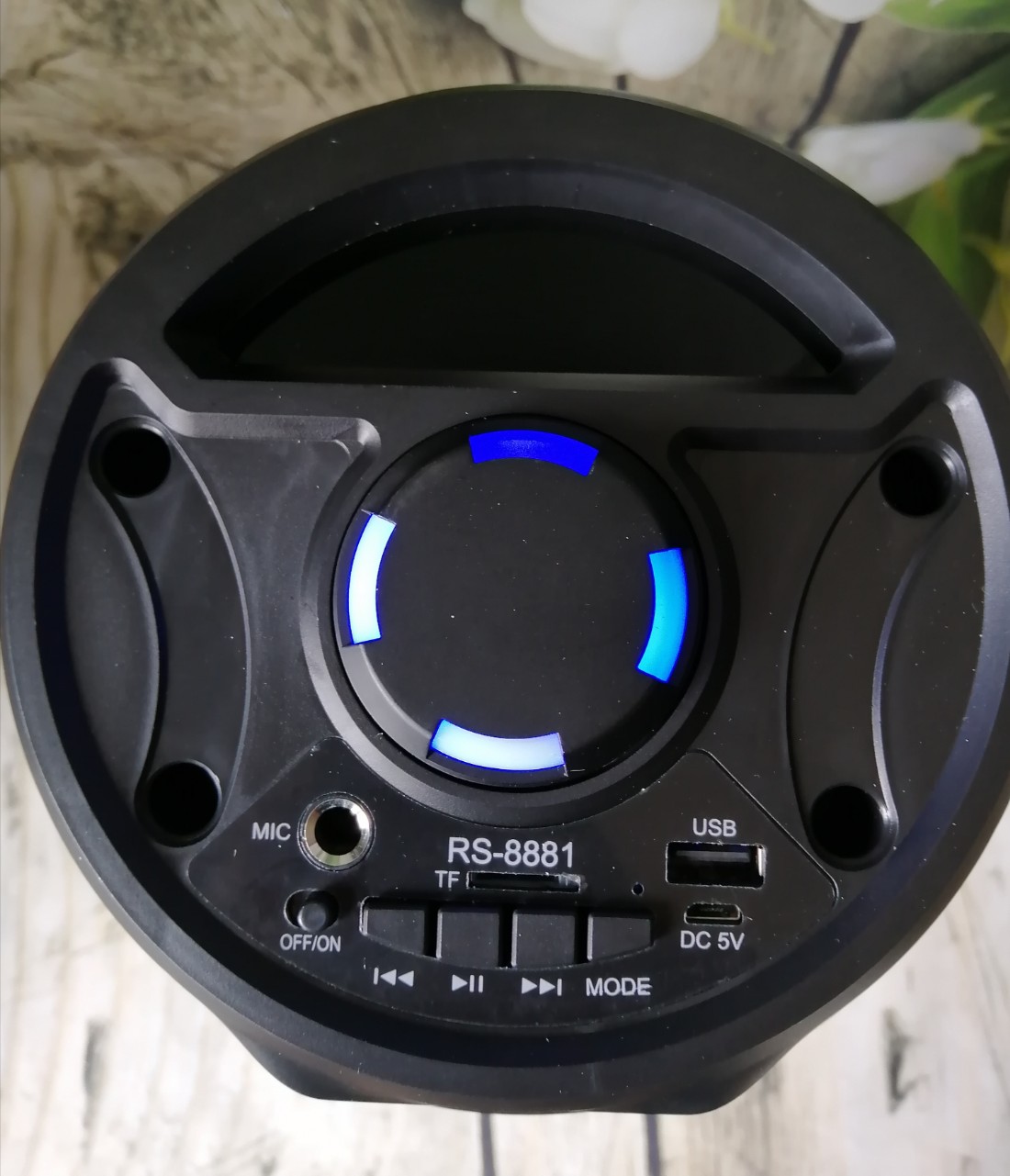 Хотите подключить к телефону не одну колонку, а две одновременно? Bluetooth колонка RS-8881 с функцией TWS позволит Вам насладится стерео звучанием любимых треков. Благодаря встроенному Bluetooth модулю, вы сможете воспроизводить вашу любимую музыку в отличном качестве прямо со смартфона и планшета. При этом для подключения не нужны провода   все происходит максимально быстро и просто. Длительную автономную работу бумбоксу обеспечивает встроенный аккумулятор емкостью 1800 мАч. При среднем уровне звука колонка честно отработает более пяти часов. Система многофункциональна: воспроизводит музыку МР3 с микро SD-карт памяти или USB флешек, линейным подключением внешних устройств через вход AUX, а также с любых устройств поддерживающих функцию Bluetooth. Диффузоры подсвечены динамичной светодиодной RGB подсветкой, что добавляет эффектность и оригинальность колонке. Встроенное FM  радио тоже будет весьма полезно. На передней панели имеется вход Jack для подключения гитары, караоке микрофона и использования колонки в качестве громкоговорителя.