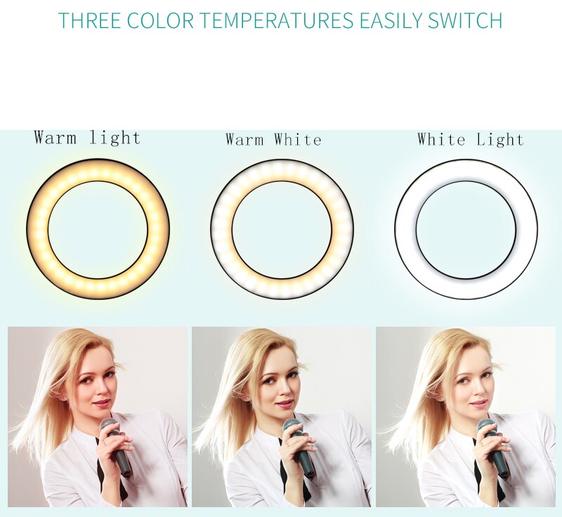 - Селфи лампа имеет три варианта освещения по яркости, а также регулируется по цветовой температуре света.