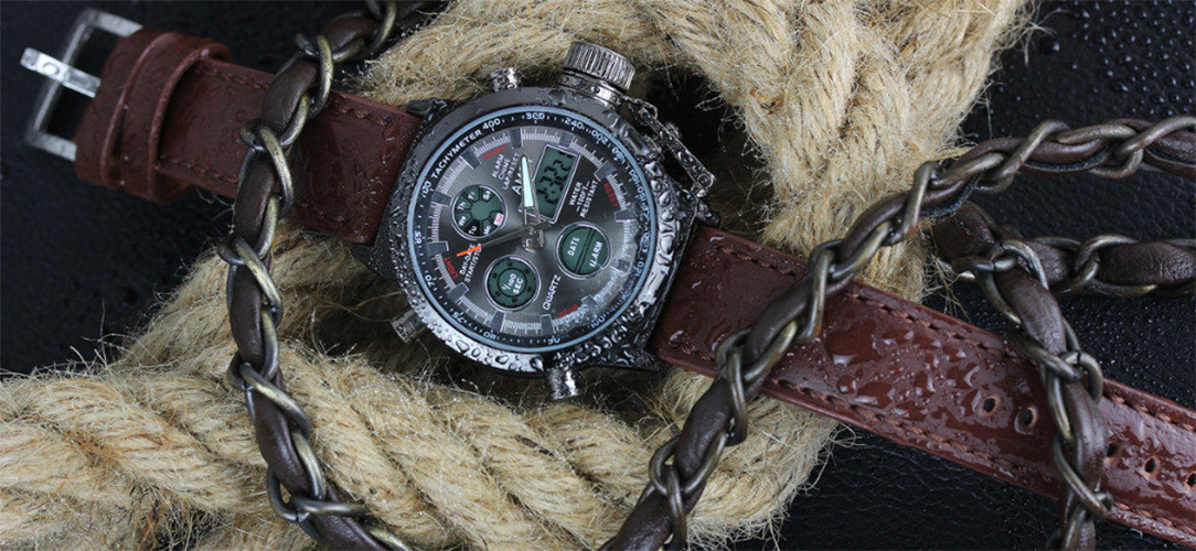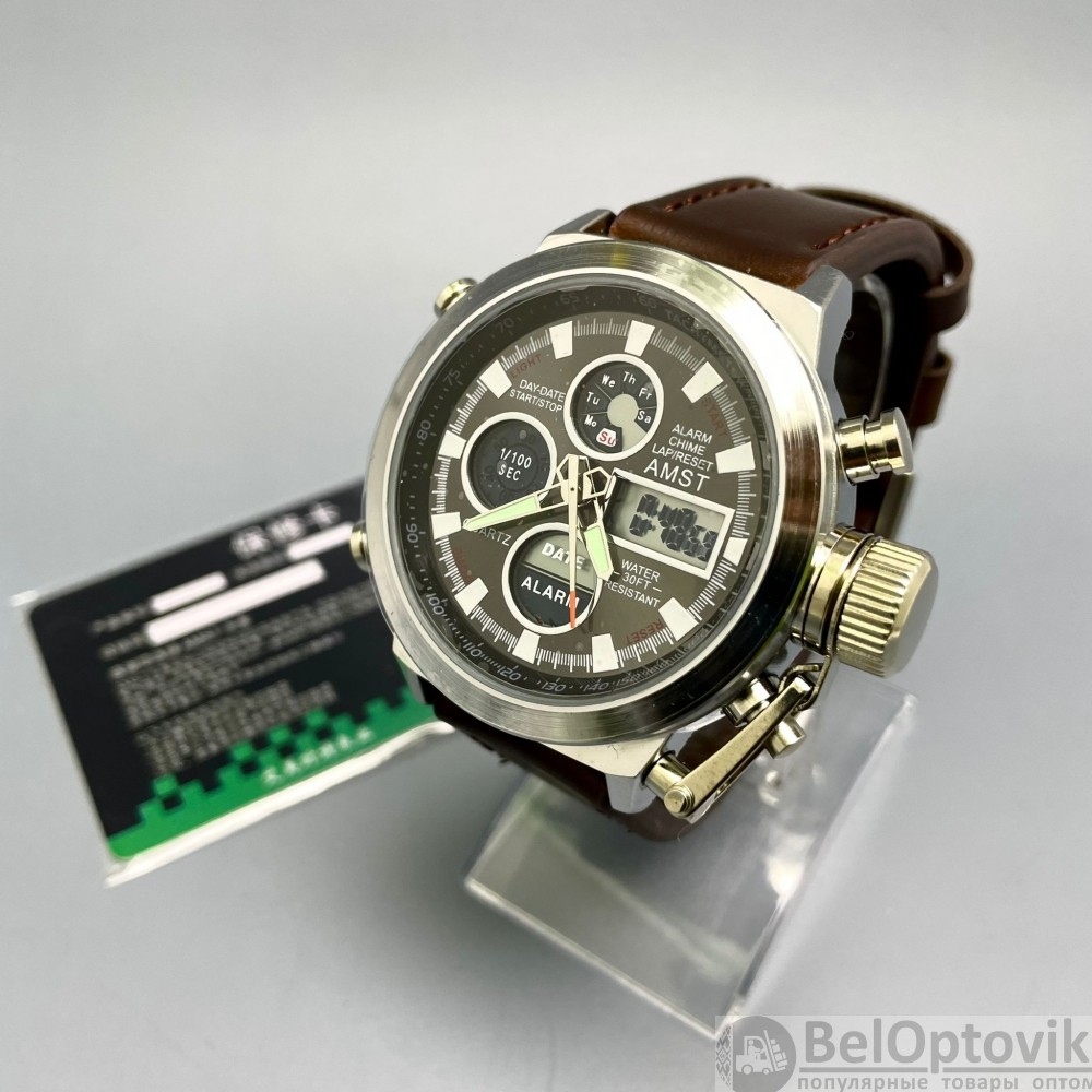 Кварцевые часы AMST 3003 B оригинальные часы в стили милитари с комбинированным отображением времени. На одном циферблате находятся, как привычные три стрелки, так и электронные LED часы, которые состоят из четырёх небольших круглых экранов. Стрелки светятся в темноте.