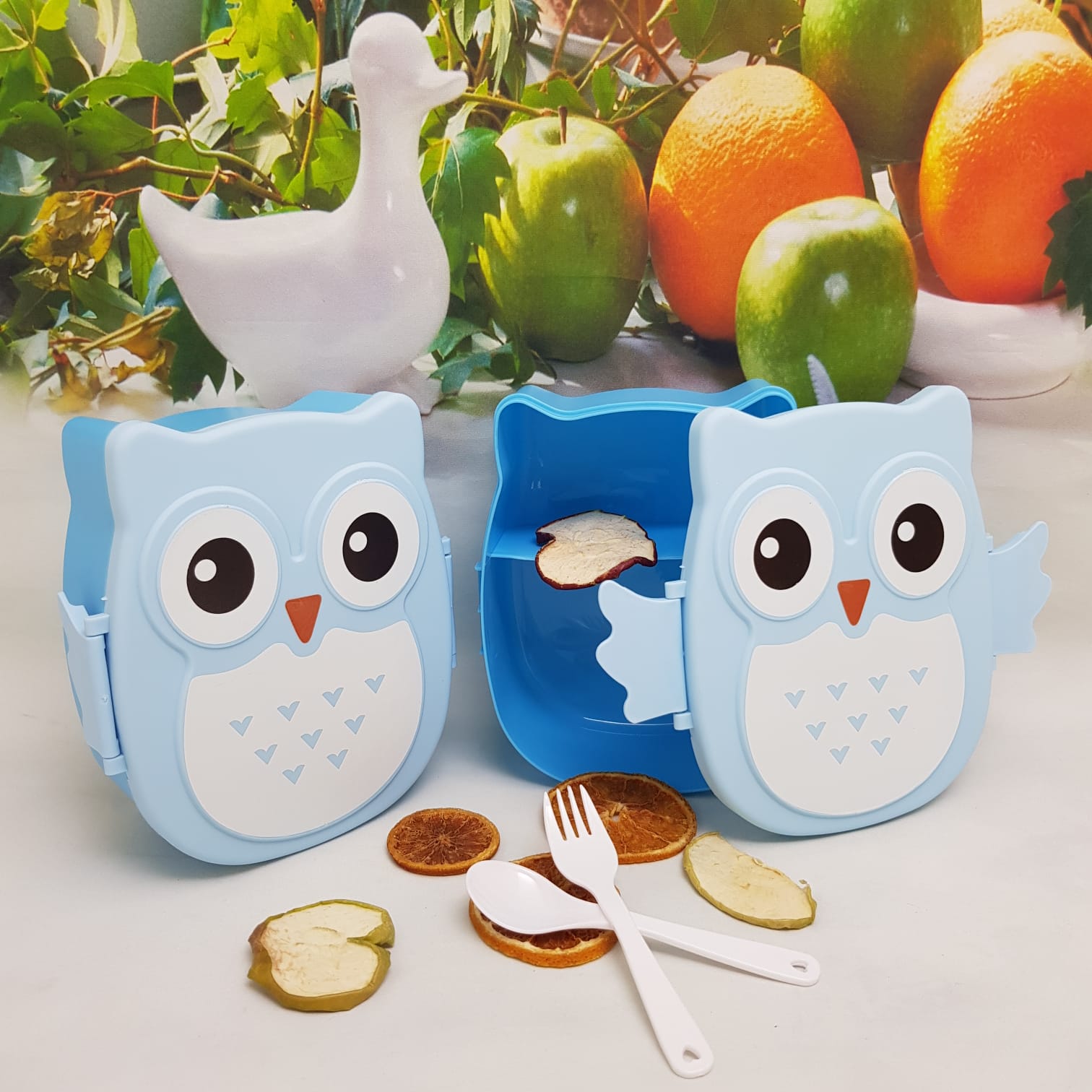 Совы уже не первый год находятся в тренде. Милый ланч-бокс из яркого и безопасного пластика имеет 2 отделения, пару столовых приборов и плотно закрывающуюся крышку. Совушку удобно носить с собой, быстро разогревать обед в микроволновой печи и можно мыть в посудомоечной машине.