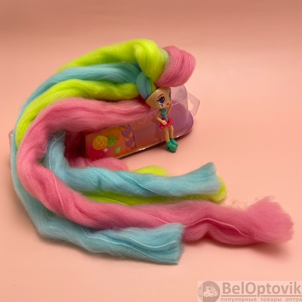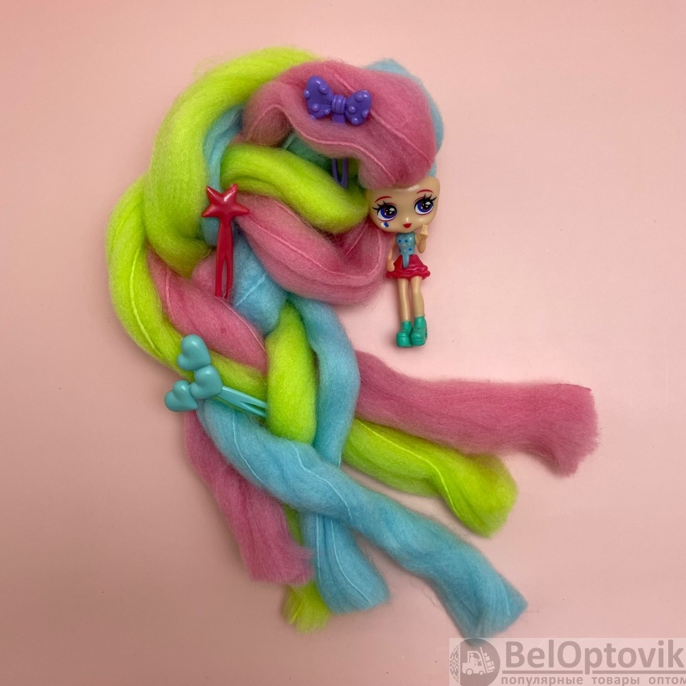 куколку высотой 8 см с длинными трех-цветными волосами (голубой, розовый, салатовый);