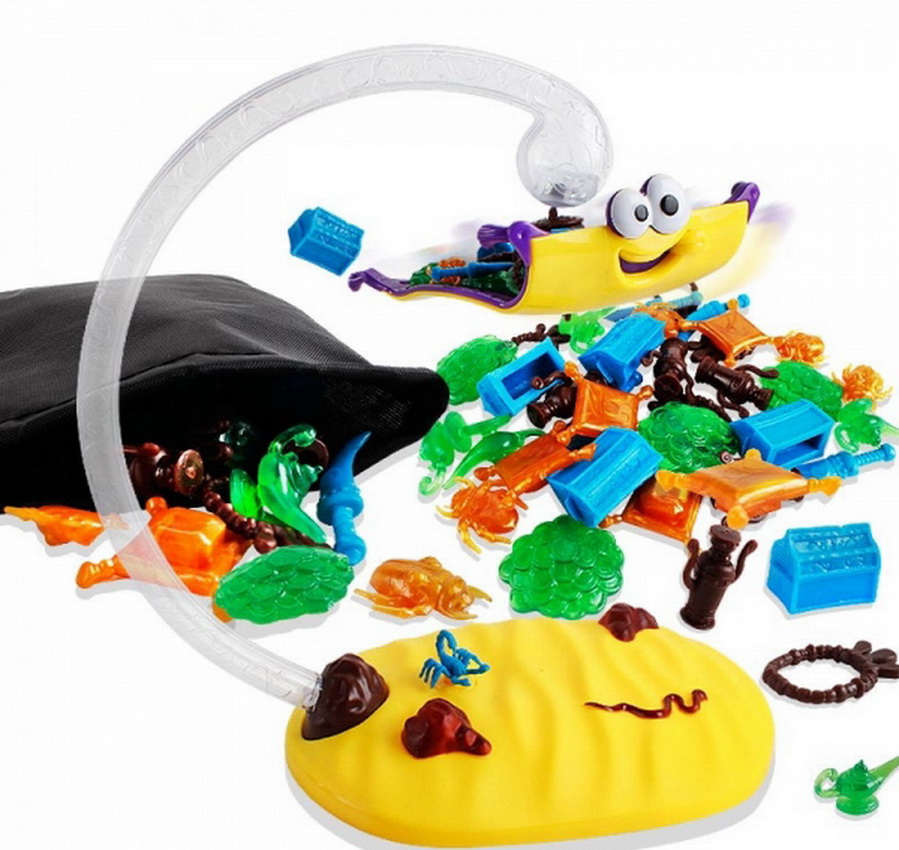 Два магнита и леска и вот вам иллюзия полета и восторг ребенка. Леску можно натягивать по-разному (поворачивая скорпиона на подставке). Соответственно, каждый раз ковер выдерживает разное количество сокровищ. А кроме этого, сокровища сами отличаются по весу. Сокровища спрятаны в мешочке и вытаскивать их надо наугад (первое попавшееся). Цель игры состоит в том, чтобы аккуратно складывать сокровища до тех пор, пока неожиданно ковер не потеряет равновесие. Сами сокровища состоят из монеток, ламп, подушечек, оружия и многого другого.