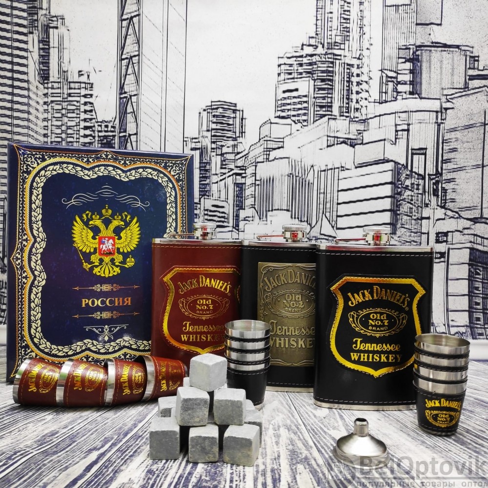 Купить подарочный набор Jack Daniels: фляжка 255 мл, 4 стопки и металлическая воронка на нашем сайте можно ОПТОМ от 20 шт. или меньше, если Вы покупаете у нас и другие товар