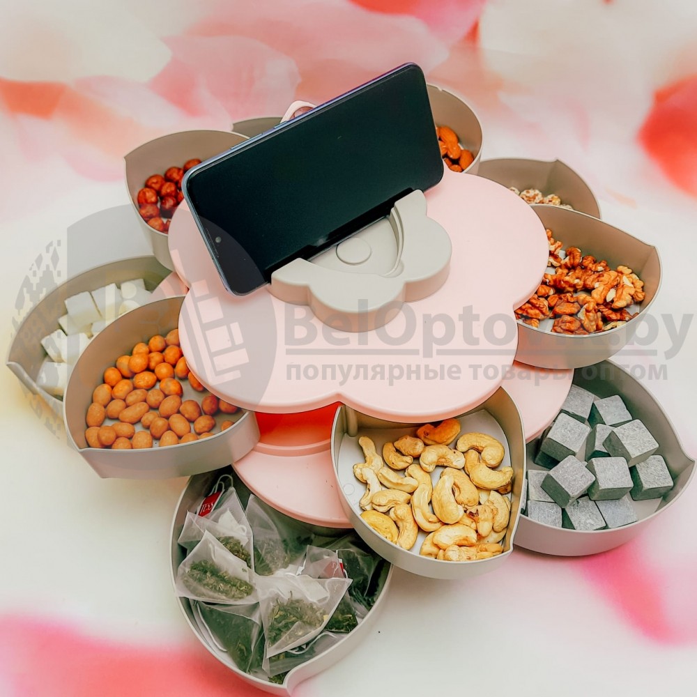 Купить конфетницу-органайзер (поднос) вращающийся с подставкой для телефона, 2 уровня "Лепесток" для снеков, сухофруктов Flower Candy Boxна нашем сайте можно ОПТОМ от 20 шт. или не менее 5, если Вы покупаете у нас и другие товары (сборный заказ).